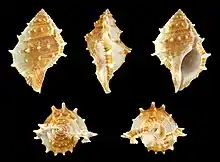 Typical shell size of B. perelegans ranges from 65 mm to 70 mm in width and 96 mm to 120 mm in height, making it the largest species of its genus.[2] Its elongated varices are perfectly aligned along the spires, its surface sculpture is finely gemmate (bud-like), and its overall shape is oblong, compressed dorso-ventrally. These three morphological features are in keeping with almost all other species in the genus Bufonaria.