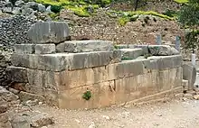 On the right hand side, straight after the entrance to the sanctuary of Delphi, one sees the base of the bull that the Corcyraeans dedicated at about 480 B.C., in order to commemorate an exceptionally good catch of tuna fish. The statue was made by the sculptor Theopropus from Aegina. According to Pausanias,[1] a bull in Corfu every day abandoned the flock and went down to the seashore, moaning. The herdsman watched him and followed him, thus noticing that the sea was full of fish. He alerted his fellow citizens and they rushed to the seashore, but they couldn't get hold of the fish. Then, they sent an envoy to the Delphic oracle and, following her advice, they sacrificed a bull to Poseidon and then caught the fish. With the tithe of the revenues they acquired by selling the fish, the Corcyreans erected the bronze bull.