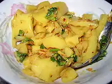 Burmese salads (Burmese: အသုပ်; transliterated athoke or athouk) are a diverse category of indigenous salads in Burmese cuisine. Burmese salads are made of cooked and raw ingredients that are mixed by hand to combine and balance a wide-ranging array of flavors and textures.[1] Burmese salads are eaten as standalone snacks, as side dishes paired with Burmese curries, and as entrees.[2] The iconic laphet thoke (fermented tea leaf salad) is traditionally eaten as a palate cleanser at the end of a meal.[3]