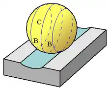 Dragging the ball across the plate will have a different effect than pressing. In that case, the force on the ball can be decomposed into two component forces: one normal to the plate's surface, pressing it in, and the other tangential, dragging it along. As the tangential component is increased, the ball will start to slide along the plate. At the same time, the normal force will deform both objects, just as with the static situation. If the normal force is low, the ball will rub against the plate but not permanently alter its surface. The rubbing action will create friction and heat, but it will not leave a mark on the plate. However, as the normal force increases, eventually the stresses in the plate's surface will exceed its yield strength. When this happens the ball will plow through the surface and create a trough behind it. The plowing action of the ball is burnishing. Burnishing also occurs when the ball can rotate, as would happen in the above scenario if another flat plate was brought down from above to induce downwards loading, and at the same time to cause rotation and translation of the ball, or in the case of a ball bearing.
