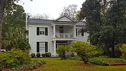 Although located in the city of Newberry, the house is built in the style of plantation houses in the countryside: it features Neoclassical components, although in a diminished and vernacular mode. The house is a two-story rectangle with a central portico dominating the facade. Square wooden pillars support each story of the portico, while pilasters in a similar style are placed at the portico's junctions with the main body of the house. As a second-story door provides access to the second story of the portico, the space between pillars and pilasters is filled with an unadorned balustrade. Multi-pane transom lights are placed above both the main entrance and the second-story door to the portico, in addition to sidelights around the main entrance. Topping the house is a gabled roof, which culminates in a pediment atop the portico.[1] The entire house is a wooden building comprising nearly 5,000 square feet (460 m2), although only about 4,000 square feet (370 m2) are finished. Three fireplaces are located throughout the building, which is underlain by a crawlspace.[3]