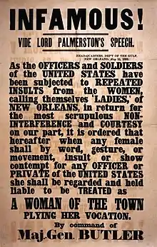 General Order No. 28 was a military decree made by Maj. Gen. Benjamin Butler during the American Civil War.[1] Following the Battle of New Orleans, Butler established himself as military commander of that city on May 1, 1862. Many of the city's inhabitants were strongly hostile to the Federal government, and many women in particular expressed this contempt by insulting Union troops.