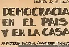 These organizations had previously worked to ensure equal rights for women. However, by 1978, Chilean society continued to be a repressive space for women, and some women began to articulate their discontent with their subordinate position in Chilean society and the political sphere. These women that stood up did so in the face of derogatory labels and accusations laid on by the opposition.[5] Tentative steps were taken by these women toward political organization on the basis of these concerns. This was the start of the re-emergence of the Chilean feminist movement in a public sphere that had been greatly reduced, within the context of the military regime.[6]