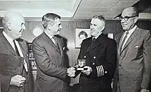 In 1965 and 1966, the John Cabot repaired the submarine cable connecting Thule Air Base in Greenland to the rest of the world.[17][18] For the efforts in repairing the telecommunications cable in November 1965, the ship's captain, Captain George S. Burdock, was awarded the Shield of NORAD in a ceremony on board CCGS John Cabot, while at dock in the Port of Montreal on 22 July 1966.[19]