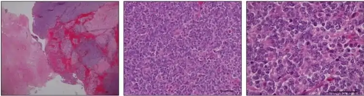 Primary sarcoma with a chimeric CIC-DUX4 protein in a 9 year-old girl, H&E stain, from Nakai et al., 2019.[14]