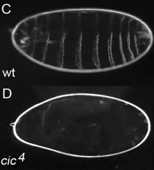Disrupted embryogenesis in a Drosophila fly due to the cic4 mutation afffecting the CIC gene. The formation of the fly's intermediate body segments is suppressed, with only the first and the last segments being developed. From Marta Fores et al., 2017.[16]