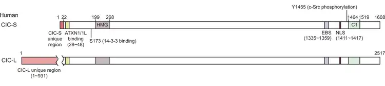 Schematic illustration of human CIC-S and CIC-L forms of the capicua protein. CIC-L has a unique long N-terminal region compared with CIC-S. The amino acid regions of CIC responsible for the interaction with ATXN1/ATXN1L, 14-3-3, and ERK, the HMG box, nuclear localization signal (NLS), c-Src-mediated phosphorylation site, and C1 domain, are depicted. Numbers indicate amino acid positions. EBS: ERK binding site. From a review by Yoontae Lee, 2020.[9]