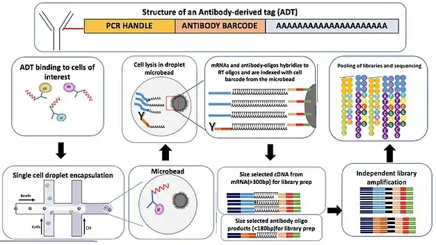 Once you have the ADTs, the next step is to bind the cells with the desired ADT pool. The scRNA-seq libraries can be prepared using Drop-seq, 10X Genomics or ddSeq methods. In brief, ADT labelled cells are encapsulated within a droplet as single cells with DNA-barcoded microbeads.[6]