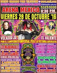 The October 31, 2014 Día de Muertos show was the first of Mexican professional wrestling promotion Consejo Mundial de Lucha Libre's Dia de los Muertos ("Day of the Dead") celebrations in 2014 and began a tradition of CMLL holding a major show to celebrate the Latin American holiday. As part of their Dia de los Muerte celebrations CMLL admitted all kids in costumes for free for the show.[3] CMLL held a second Dia de los Muerte celebration on Sunday November 2 as well. Both shows included the Edcanes, CMLL's ring girls and various wrestlers dressed up in traditional Día de Muertos garb. In 2014, CMLL also turned the basement of Arena México into a haunted house attraction before each show.[4] CMLL has held one or more shows to celebrate the holiday annually since 2014, with 2016 marking the third year in a row.