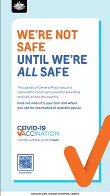 The general COVID-19 vaccination in Australia program began on 22 February 2021 in response to the COVID-19 pandemic, with the goal of vaccinating all willing people in Australia before 2022. Front-line workers[lower-alpha 1] and aged care staff and residents had priority for being inoculated, before a gradual phased release to less-vulnerable and lower-risk population groups throughout 2021. The Therapeutic Goods Administration (TGA) approved four vaccines for Australian use in 2021: the Pfizer–BioNTech vaccine on 25 January, the Oxford–AstraZeneca vaccine on 16 February, Janssen vaccine on 25 June and the Moderna vaccine on 9 August.[4][5][6][7] Although approved for use, the Janssen vaccine was not included in the Australian vaccination program as of June 2021.[8]