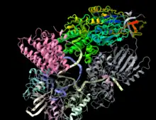 PDB-6V4X. CPSF2 protein highlighted within the CPSF complex. CPSF2 is rainbow colored. Other subunits of the complex are represented by solid colors.