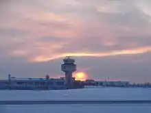 During the 1950s, while the airport was still named Uplands and a joint-use civilian/military field, it was the busiest airport in Canada by takeoffs and landings, reaching a peak of 307,079 aircraft movements in 1959,[9] nearly double its current traffic. At the time, the airport had scheduled airline flights by Trans-Canada Air Lines (Toronto, Montreal, and Val-d'Or), Trans Air (Churchill), and Eastern Air Lines (New York via Syracuse and Washington via Montreal).[9] With the arrival of civilian jet travel, the Canadian government built a new field south of the original one, with two much longer runways and a new terminal building designed to handle up to 900,000 passengers/year. The terminal building had been scheduled to open in 1959, but during the opening ceremonies, a United States Air Force F-104 Starfighter went supersonic during a low pass over the airport, and the resultant sonic boom shattered most of the glass in the airport (including the entire north wall) and damaged ceiling tiles, door and window frames, and even structural beams.[10] As a result, the opening was delayed until April 1960. The original terminal building and Trans-Canada Airways/DOT hangar continued in private use on the airport's north field until the fall of 2011 when it was demolished.