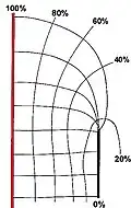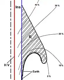 Equipotential lines are shown here, which can be compared with the contour lines on a map of a mountainous region: the nearer these lines are to each other, the steeper the slope and the greater the danger, in this case, the danger of an electrical breakdown. The equipotential lines can also be compared with the isobars on a weather map: The denser the lines, the more wind and the greater the danger of damage. In order to control the equipotential lines (that is to control the electric field) a device is used that is called a stress cone, see figure 9.[10] The crux of stress relief is to flare the shield end along a logarithmic curve. Before 1960, the stress cones were handmade using tape—after the cable was installed. These were protected by potheads, so named because a potting compound/dielectric was poured around the tape inside a metal/ porcelain body insulator. About 1960, performed terminations were developed consisting of a rubber or elastomer body that is stretched over the cable end.[11] On this rubber-like body R a shield electrode is applied that spreads the equipotential lines to guarantee a low electric field.