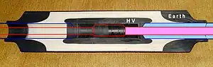 A high-voltage cable (HV cable) is a cable used for electric power transmission at high voltage. A cable includes a conductor and insulation. Cables are considered to be fully insulated. This means that they have a fully rated insulation system that will consist of insulation, semi-con layers, and a metallic shield. This is in contrast to an overhead line, which may include insulation but not fully rated for operating voltage (EG: tree wire). High-voltage cables of differing types have a variety of applications in instruments, ignition systems, and alternating current (AC) and direct current (DC) power transmission. In all applications, the insulation of the cable must not deteriorate due to the high-voltage stress, ozone produced by electric discharges in air, or tracking. The cable system must prevent contact of the high-voltage conductor with other objects or persons, and must contain and control leakage current. Cable joints and terminals must be designed to control the high-voltage stress to prevent the breakdown of the insulation.