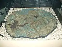 The earliest settlement on the site is represented by pits and post holes dated with Neolithic pottery and flints.[17] These are the remains of a small agricultural settlement which was unenclosed.[18] Bones recovered from the site have been radiocarbon dated to 3500 and 3300 BC.[11] A bank under the later Iron Age defences is likely to be a lynchet or terrace derived from early ploughing of the hilltop. The site was also occupied in the Late Bronze Age, from which ovens have been identified.[19] Radical revisions of the Bronze Age archaeology on the lower slopes[20] resulted from discoveries during excavations and survey work by the South Cadbury Environs Project.[21] Finds include the first Bronze Age shield from an excavation in northwest Europe, an example of the distinctive Yetholm-type. Carbon dating implies that the shield was deposited in the 10th century BC, although metallurgical evidence suggests that it was manufactured two centuries earlier.[22][23] A metal-working building and associated enclosure were discovered 2 km (1.2 mi) south east of the hillfort, roughly contemporary with the period of manufacture.[24]
