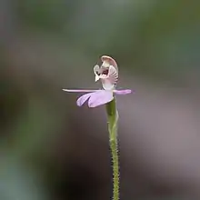 Caladenia pygmaea, is a terrestrial, perennial, deciduous, herb with an underground tuber and a single erect, sparsely hairy leaf, 20–30 mm long and 2–3 mm wide. A single flower 5–6 mm wide is borne on a spike 50–100 mm high. The sepals and petals are pale pink on the front and pale green and slightly hairy on the back. The dorsal sepal is 2.5–3 mm long, about 2 mm wide and curves forward forming a hood over the column. The lateral sepals and petals are about the same size as the dorsal sepal, with the petals spreading and the lateral sepals parallel to and often touching each other along their length. The labellum is about 3 mm long and 2 mm wide, pink or white with red bars. The sides of the labellum turn upwards and almost surround the column and the tip is a small yellow triangle with a few blunt teeth on its sides. Flowering occurs in October.[2]