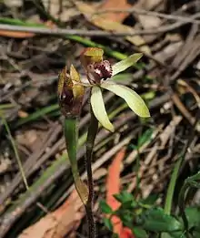 Caladenia transitoria, commonly known as green caps, is a species of orchid endemic to south-eastern Australia. It has a single, long, erect, hairy leaf and one or two greenish-yellow flowers with purplish backs.