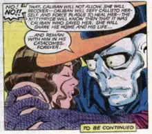 Shortly thereafter, Morlock leader Callisto desires a consort and has the Morlocks abduct Warren Worthington, the Angel and a member of the X-Men, to be her husband. The X-Men arrive in the sewers to rescue their ally, and Kitty is infected with a virus by Plague. Caliban takes her to his quarters to care for her. Kitty pleads with Caliban to allow her to assist her teammates. Caliban agrees, but only if she will return after the fight and stay with him. Though Kitty promised to stay with him forever, she left and returned home.[2] Weeks later, Callisto, vengeful after losing a one-on-one battle with X-Men leader Storm, orders the Morlocks to kidnap Kitty to force her to marry Caliban, knowing Storm would return. Caliban, however, realized Kitty did not truly love him and released her from her promise. Kitty then became Caliban's friend.[3]
