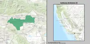 As of the 2020 redistricting, California's 35th congressional district is located in Southern California, within the Inland Empire. The district covers east Los Angeles County, southwest San Bernardino County, and a small part of west Riverside County.
