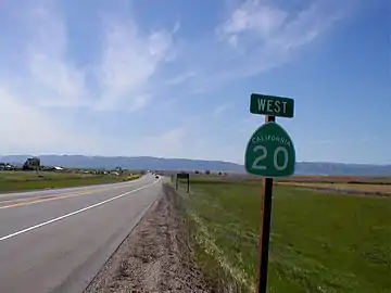 State Route 20 (SR 20) is a state highway in the northern-central region of the U.S. state of California, running east–west north of Sacramento from the North Coast to the Sierra Nevada. Its west end is at SR 1 in Fort Bragg, from where it heads east past Clear Lake, Colusa, Yuba City, Marysville and Nevada City to I-80 near Emigrant Gap, where eastbound traffic can continue on other routes to Lake Tahoe or Nevada.