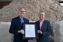 The table below shows the top 21 commodities, by dollar value, produced in California in 2017.[1] Between 2016 and 2017, there were increases by more than 2% in total value for the following crops: almonds, dairy, grapes and cattle. The largest increase was seen in almond sales, which increased by 10.9% from 2016 to 2017, due to both increases in crop volume produced and the average market price for a pound of almonds. Dairy sales increased 8.2% from 2016 to 2017 due to an increase in the average price for milk, despite a slight decrease in total milk production. Grape sales increased by 3.1% from 2016 to 2017 due to an increase in price per ton of grape (from $832 per short ton ($917/t) in 2016 to $847 per short ton ($934/t) in 2017). Cattle sales also increased by 2.7% from 2016 to 2017.[3][4]