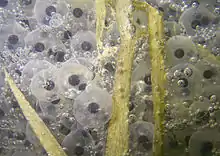 Breeding occurs from late December to early April.[10] The male frog's advertisement call is a series of a few small grunts, usually given while swimming around under water. Choruses are weak and easily missed. The adult California red-legged frog is nocturnal, while juvenile frogs are both nocturnal and active during the daytime.[10] The species inhabits dense, shrubby, or emergent riparian vegetation and still or slow-moving perennial and ephemeral water bodies that also serve as breeding sites. This species has been noted to utilize upland habitats as adults near aquatic areas (such as creeks). They often use these zones for basking and searching for prey.[14] They prefer tall plants such as cattails for protection and to lay eggs.[10]