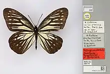 C. sagitta. Whitish, yellowish beneath, with dark veins, longitudinal shadows at the costal and hind margins, and feeble angle-shaped markings before the margin. On the Yang-tse-kiang. Two forms are known: sagitta Leech (41a),from Chang-Yang on the middle Yang-tse-kiang, is the light-coloured form, while occidentalis Leech, the western form from Wa-su-kow, has the ground-colour slightly shaded with ochreous and bears strong dark vein-streaks, the distal area of both wings being shaded with fuscous. According to Leech the nymotypical form appears to be very abundant at Chang -Yang.[2]