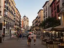 Straddling along the Centro and Arganzuela districts, it starts at the Plaza Mayor and ends at the Glorieta de las Pirámides.[1] It was already named Toledo in the 16th century.[2] Until the late 15th century it ended at the Hospital of La Latina.[2] In the early 17th century the part near the Plaza Mayor was widened.[2] Following the 1790 fire in the Plaza Mayor, the buildings of the Portal de Cofreros were rebuilt with new materials following the anti-fire regulations dictated by Juan de Villanueva.[3] The street consolidated as one of the specialised commercial streets in the city centre by the early 20th century.[4] The image of the northernmost end near the Plaza Mayor became a part of the Antifascist collective memory with the photograph of the ¡No pasarán! banner[n. 1] hanged in the street during the Spanish Civil War.[5]