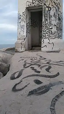 The practice of calligraffiti appears to have begun in the Middle East and North Africa in around the 1950s, when local artists, searching for a visual language that expressed their national identity and heritage, began incorporating Arabic letters, as a graphic form, into their artworks.[12] Artists such as the Lebanese painter and poet, Etel Adnan (b. 1925); the Egyptian painter, Ramzi Moustafa (b. 1926) and the Iraqi painter-sculptor and philosopher, Shakir Hassan Al Said (b.1925) all searched for ways to use Arabic letters in abstract compositions.[13]