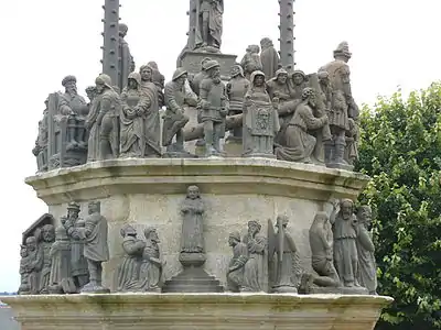This calvary is part of the Plougonven "enclos paroissial". On an octagonal base, the structure is 4 metres high and on the two corniches running around this base are a series of sculptural groups which depict scenes from the life and death of Jesus Christ. Erected in 1554, the sculptural work was executed by the workshop of the "ymageurs", Bastien and Henry Prigent (see note 1) who also worked on the calvary at Pleyben. The calvary suffered considerable damage in 1794 during the aftermath of the French revolution after which the statues were hidden away in the cemetery grounds by the local people for safe-keeping. In 1810 the calvary was re-erected but with a wooden cross, this replaced in 1836 by a cross in stone. Then from 1897 to 1898, the sculptor Yann Larhantec carried out a substantial restoration, taken further in 2009 by Pierre Floc'h. The Calvary is dedicated to St Yves the parish's patron. The enclosure church itself dates to 1523 and is designed in the shape of a Latin cross with a nave and eight side chapels. It contains many sculptures and interesting features.[1][2][3][4] The "enclos" was listed as an historic monument in 1916.