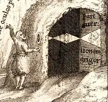 The use of the camera obscura to project special shows to entertain an audience seems to have remained very rare. A description of what was most likely such a show in 1656 in France, was penned by the poet Jean Loret, who expressed how rare and novel it was.[72] The Parisian society were presented with upside-down images of palaces, ballet dancing and battling with swords. Loret felt somewhat frustrated that he did not know the secret that made this spectacle possible. There are several clues that this may have been a camera obscura show, rather than a very early magic lantern show, especially in the upside-down image and Loret's surprise that the energetic movements made no sound.[73]