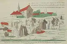 A law of 1789 abolished monastic vows in France. In 1790 the Civil Constitution of the Clergy suppressed religious bodies and was supposed to empty all convents. The Carmelites of Paris addressed a petition to the National Constituent Assembly on behalf of all their order and obtained permission to preserve their buildings and their community life.[17] The respite was short-lived. On 2 September 1792, when the first massacres of monks and clergy in the prisons had already begun, five men tried to force the door of their convent.[18] On 14 September 1792 two commissaries of the commune of Paris opened the doors of the convent and went through the building collecting and plundering all the precious objects. They then expelled the Carmelites before allowing the population to enter.[19]