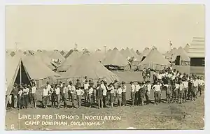 Soldiers line up for Typhoid Inoculation, Camp Doniphan, ca. 1917-1918.