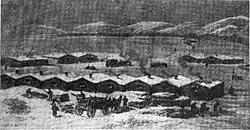 Camp Poplar River was established during the Indian wars in the Department of Dakota by U.S. Army to maintain order, keep non-agency Indians away, and help capture the Indians who disturbed the peace and would not conform to reservation boundaries of the Fort Peck Agency, which in 1878, was relocated to its present-day location in Poplar because the original agency was located on a flood plain, suffering floods each spring.[1] The post was located one-half mile north of the then called, Poplar River Agency, or 2 miles north of the Missouri River on the south bank of the Poplar River and normally consisted of only two companies of infantry. This tiny post has disappeared except for the fact that the town of Poplar, Montana, on the site, bears the same name.[2]