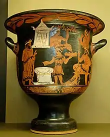 The workshop in Cumae was founded very late. After 350 BC, its founder, the CA Painter and his collaborators and successors worked there. The CA Painter is considered as the outstanding artist of his group, or even of Campanian vase painting as a whole. From 330 onwards, a strong Apulian influence is visible. The most common motifs are naiskos and grave scenes, dionysiac scenes and symposia. Depictions of bejewelled female heads are also common. The CA painter was polychrome but tended to use much white for architecture and female figures. His successors, the CB Painter and CC Painter were not fully able to maintain his quality, leading to a rapid demise, terminating with the end of Campanian vase painting around 300 BC.[3]