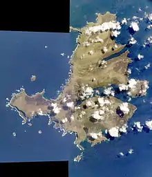Campbell Island is an extinct alkaline shield volcano that marine erosion has worn down into its present shape.[33][34] The volcano has been extinct for some six million years and glacial ice cover prevented vegetation from growing on the island until approximately 15,000 years ago.[35] Basalt, hawaiite, mugearite and trachyte are the dominant volcanic rocks comprising Campbell Island. They were erupted between 6.5 and 11 million years ago during the Miocene epoch.[34] The island is considered to be part of the submerged continent of Zealandia.
