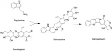 Like all other monoterpenoid indole-alkaloids, biosynthesis of camptothecin requires production of the strictosidine. Strictosidine is synthesized through condensation reaction between tryptamine from shikimate pathway and secologanin from either mevalonate (MVA) pathway or non-mevalonate pathway (MEP).[24] Strictosidine then undergoes intermolecular cyclization to produce strictosamide, which is converted to camptothecin through a series of oxidation reactions by enzymes that still needs to be resolved.[25]