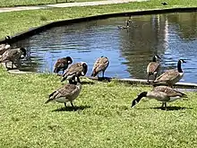 Canada geese were introduced as a game bird into New Zealand in 1905.[1] They were protected under the Wildlife Act of 1953 and the population was managed by Fish and Game New Zealand who culled excessive bird numbers. The number of birds increased and by 1996 they had reached an estimated population of 40,000 in the South Island.[1] In 2011 the government removed the protection status allowing anyone to kill the birds.[2][3]