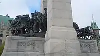 On the north and south faces of the statuary base are the dates 1914–1918 (the First World War) above the words Service to Canada/Au service du Canada,[20] which are intended to include all Canadians who served in all armed conflicts, past, present, and future. The dates 1939–1945 (the Second World War) and 1950–1953 (the Korean War) are on the east and west flanks of the base, while the years 1899–1902 (the Second Boer War) and 2001–2014 (the War in Afghanistan) are on the east and west arch pier footings, respectively.[21] The Tomb of the Unknown Soldier rests in the podium surface immediately in front of and on axis with the war memorial.