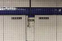 The walls of the station contain cobalt blue tile bands[31] with darker blue borders.[32] Since Canal Street is an express station, it has a wider tile band than local stations.[32] The tile colors are intended to help riders identify their station more easily, part of a color-coded tile system for the entire Independent Subway System.[31][32] The tile colors were designed to facilitate navigation for travelers going away from Lower Manhattan; on the Eighth Avenue Line, the tiles change color at the next express station to the north. As such, the blue tiles used at the Canal Street station were also used on Spring Street, the local station to the north; the next express station, West Fourth Street, used a different tile color.[33][34]