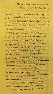 The Cantar de los Siete Infantes de Lara ("Song of the Seven Lara Princes") is a legend, perhaps derived from a lost cantar de gesta, that relates a tale of family feuding and revenge, centering on the murder of the eponymous seven infantes (princes) of Lara or Salas. The legend survives in prose form in medieval chronicles, the oldest being in the extended version of the Estoria de España (History of Spain) compiled during the reign of Sancho IV of Castile before 1289 (edited by Ramón Menéndez Pidal under the name Primera Crónica General).[1]