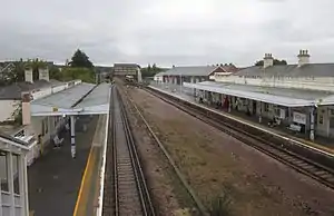 Two months later on 13 April 1846, services were extended to Ramsgate,[8] and to Whitstable after conversion of the Canterbury and Whitstable Railway and closure of the Canterbury North Lane terminus.[9][5] The station was built with two central through tracks and three platforms, one for the Whitstable branch.[10]