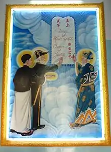 To highlight this objective of unity, there is a representation of the Divine Covenant of The Third Amnesty (The Third Alliance) inside every Cao Đài Temple. This Covenant between Heaven and Earth is written and presented to humanity by the Venerable Saints Victor Hugo, Sun Yat Sen, and Trạng Trình Nguyễn Bỉnh Khiêm. Their mission is said to guide humanity into the way of the Third Amnesty. The Covenant is written in French: "Dieu et Humanité Amour et Justice"; and in Chinese: 天上天下 博愛公平. This translates into English as: "God and Humanity [for] Love and Justice."[17]
