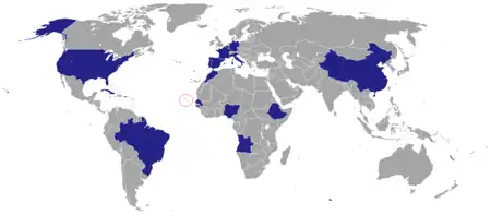 Cape Verde follows a policy of nonalignment and seeks cooperative relations with all friendly states.[18] Angola, Brazil, China, Libya, Cuba, France, Guinea-Bissau, Germany, Italy, Portugal, Spain, São Tomé and Príncipe, Senegal, Russia, Luxembourg, and the United States maintain embassies in Praia.[18] Cape Verde maintains a vigorously active foreign policy, especially in Africa.[18]