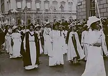 From the mid-1900s onwards, Fahey became an active member of the Women's Social and Political Union (WPSU), took part in suffragette activism and appears on the Suffragette Roll of Honour recording those who served prison sentences for the cause.[12] She joined the WSPU in 1908, and within two years became organiser for Middlesex.[8] At the time she was living with Vera Wentworth in London.[4] Fahey also helped at Longdown Farm, organising suffragette meetings in central Buckinghamshire,[13] where she stayed in the summers of 1908 and 1909.[14]