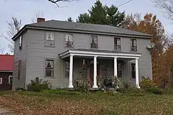 The Captain John Gunnison House is located in a rural setting of central Goshen, on the north side of Goshen Center Road about 1 mile (1.6 km) east of New Hampshire Route 31. It is a two-story wood-frame structure, with a hip roof and clapboarded exterior. Its main facade has five bays, with the door centered, with flanking sidelight windows and a false fanlight above. A single-story porch extends across the center three bays, supported by round columns. Two interior chimneys rise behind the main roof ridge, and only one of its original four fireplaces survives. The interior includes a number of 19th-century features, including stencilwork and feather painting.[2]