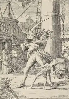 In A. C. Crispin's 2011 novel Pirates of the Caribbean: The Price of Freedom, Captain Hook appears in a conversation between Captain Teague and Pirate Lord Don Rafael: "You'll never guess who I encountered at Oporto a few months ago. [...] James. [...] He's lost a hand. [...]he said it wasn't so bad, the hook was as good as a dagger in a fight. [...] He didn't look a day older, not a day. [...] James was a lot more...subdued. [...] The taberna keeper's little lad came round to collect our plates, and when he turned and saw he, for just a second he looked—scared. No, worse than that. Terrified. [...] Can you imagine that? Afraid! Of a young boy!"[33] One of the early concept arts for Pirates of the Caribbean: At World's End showed a pirate similar to Captain Hook as one of the Pirate Lords of the Fourth Brethren Court.