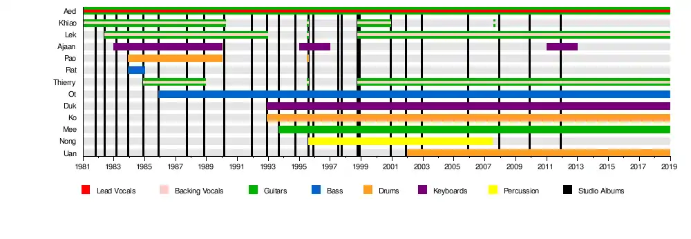 Since then, the band has recorded several more albums, with another recent upsurge in critical and commercial success. They have now released a total of 28 official studio albums (Vol. 1 - Vol. 28 / 1981 - 2013), with some special albums, numerous live albums and compilations bringing the total to more than 60.[6] The lineup has also remained stable, although percussionalist Nong left the band due to illness after their 25th albums, and later died. Additionally, classic-era members Keo (Khiao) and Ajaan have occasionally appeared on their post-millennium albums and live shows, though they have not been official members for years.