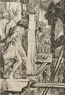 Despite being intensely personal imaginative creations, for Piranesi "a source of self-analysis and of creative release",[3] aspects of the Carceri draw on Piranesi's early training as a set designer for the stage; prison scenes were often called for. Surviving drawings for complicated sets by Filippo Juvarra and Ferdinando Bibiena (both primarily architects) as well as others have evident similaries to the prints in their receding spaces and disappearing staircases. Number XI in the series is also very similar, in reverse, to a Piranesi drawing Study for a palatial interior in the British Museum.[4]