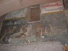 In one room, which was a nymphaeum courtyard, an elegant third-century AD fresco depicting Proserpine and other divinities among cherubs in a boat (3 m × 5 m (9.8 ft × 16.4 ft)) can be found, as can traces of another marine fresco and mosaics in the window arches. Between the third and the fourth century AD, some modifications were made to the rooms, and a sort of oratory was made, with Christian-themed frescoes, while in the other rooms the decorations did not specifically have Christian themes (winged genies, garlands, birds, etc.). A confessio was also built in the fourth century AD in a passageway behind the Clivus Scauri. The walls of the confessio were frescoed with Christian themes (e.g., the beheading of Saints Crispus, Crispinus, and Benedicta, female figures and an orante or "person in prayer").[3]